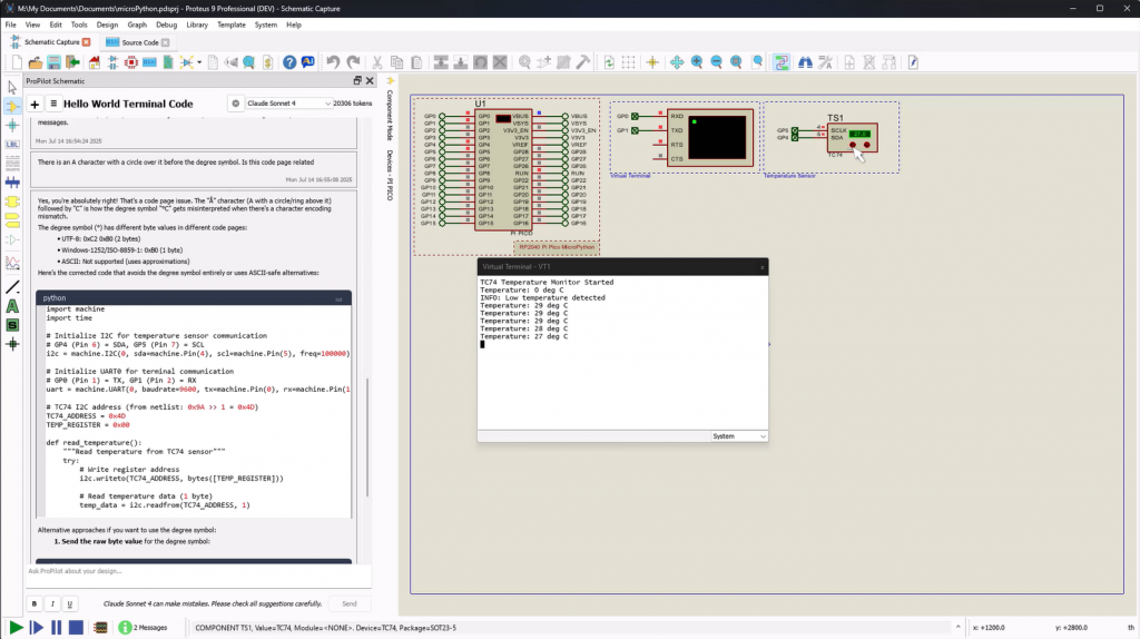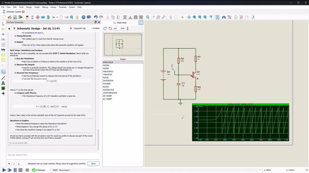 ● Proteus界面 + 虚拟仪器 + 原理图窗口 + 左侧弹出AI对话窗口